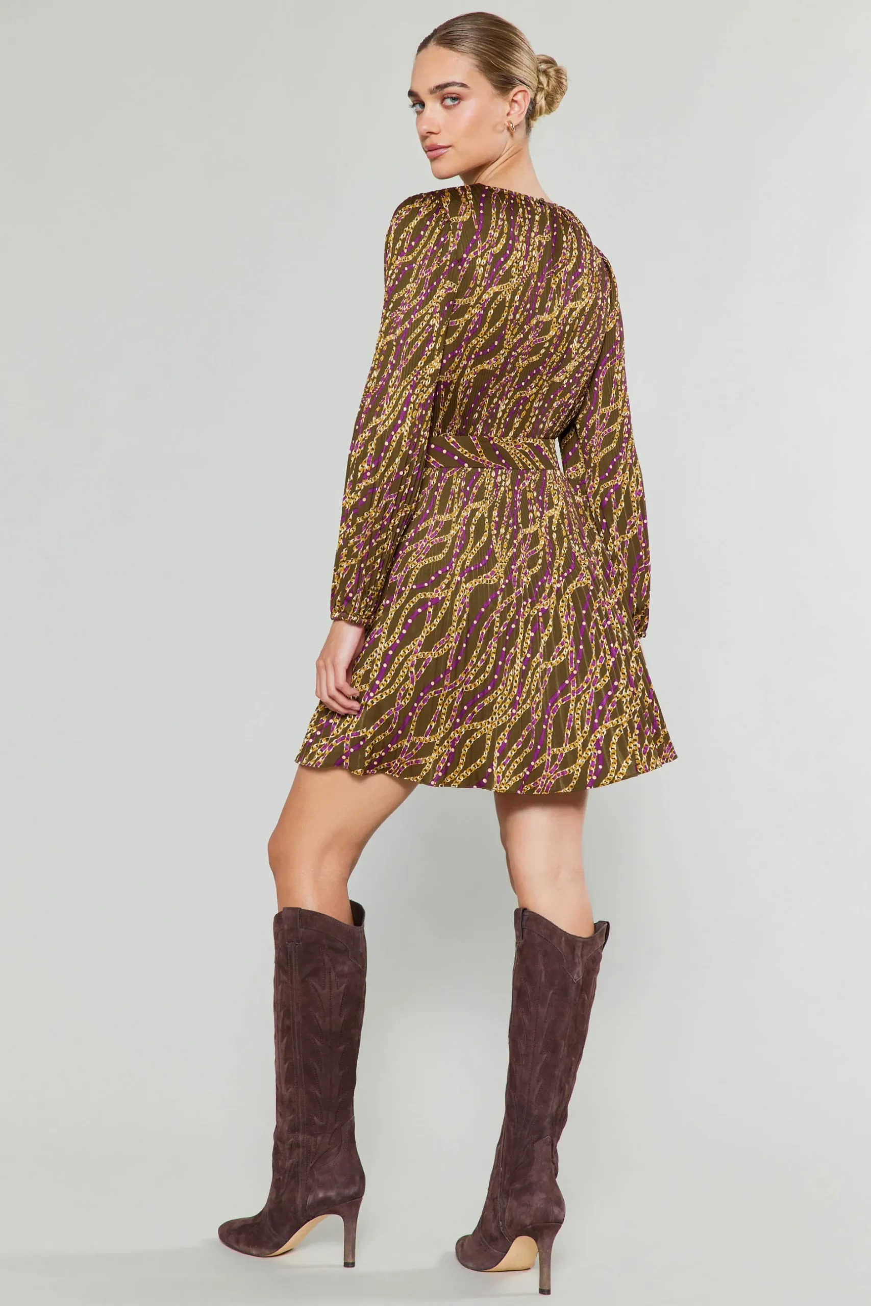 Light as a breeze, this golden link-print mini dress showcases blousy long sleeves, elasticized cuffs, and pleat detailing. A delicate self-tie at the neckline finishes the look.