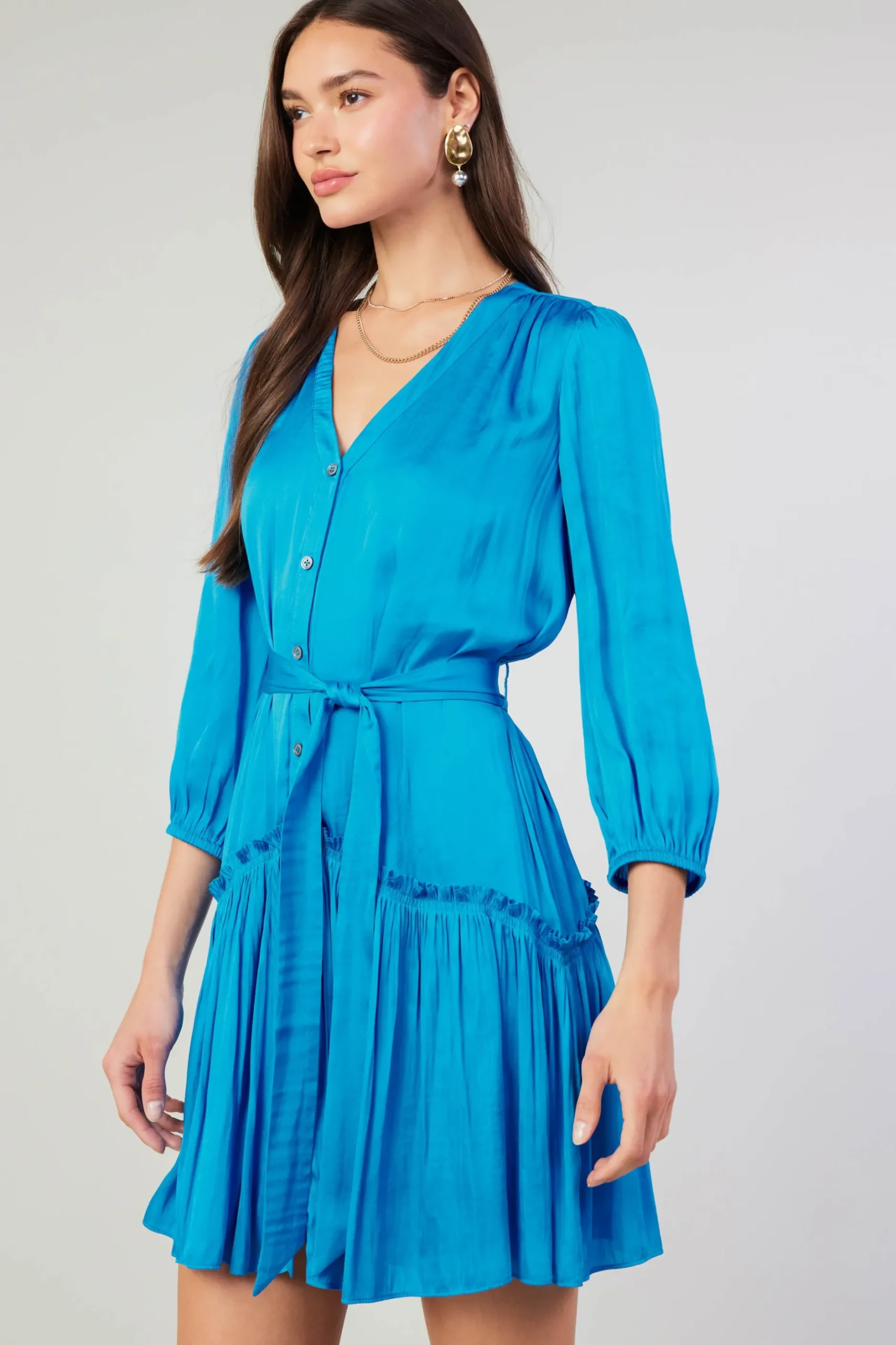 It’s electric. A brilliant blue shade energizes this button down midi dress. Framed by three-quarter sleeves, the V-neck style has a waist-defining tie belt and a curved ruffle adorning the skirt.
