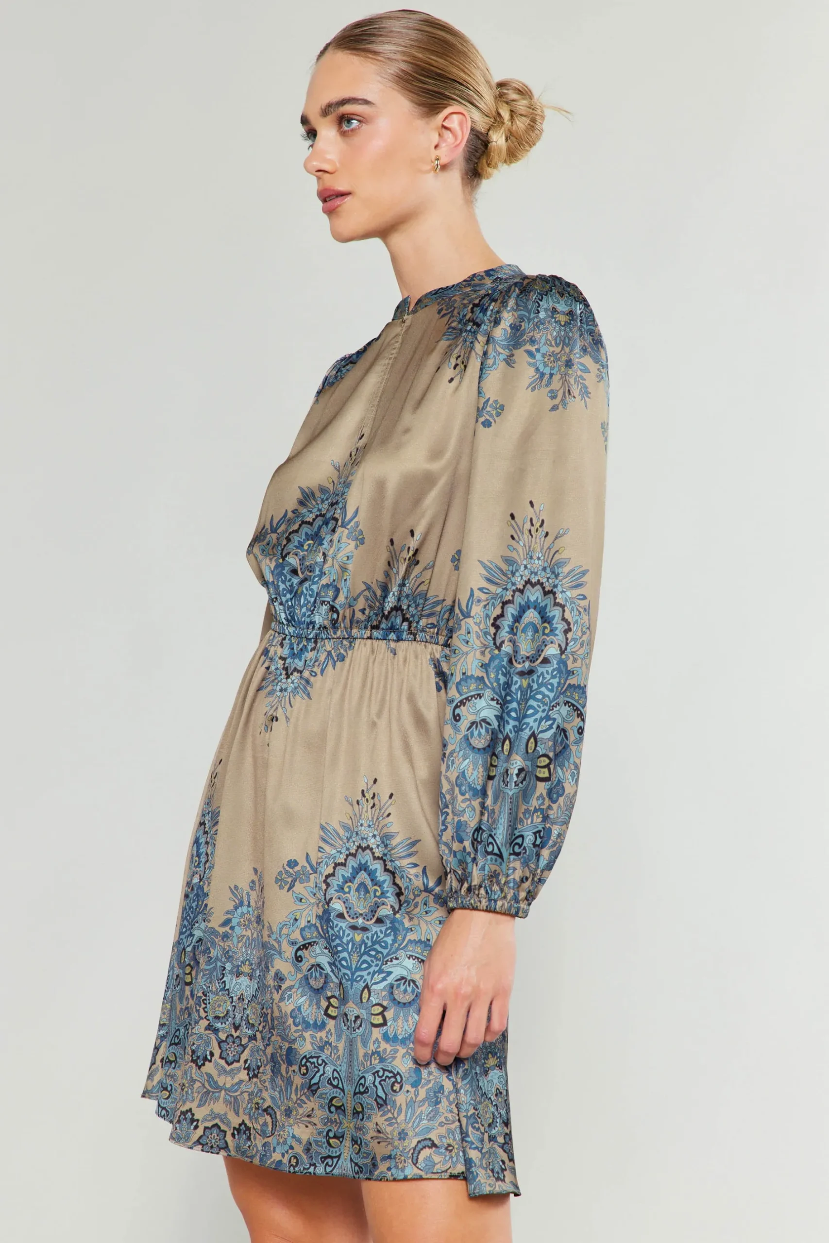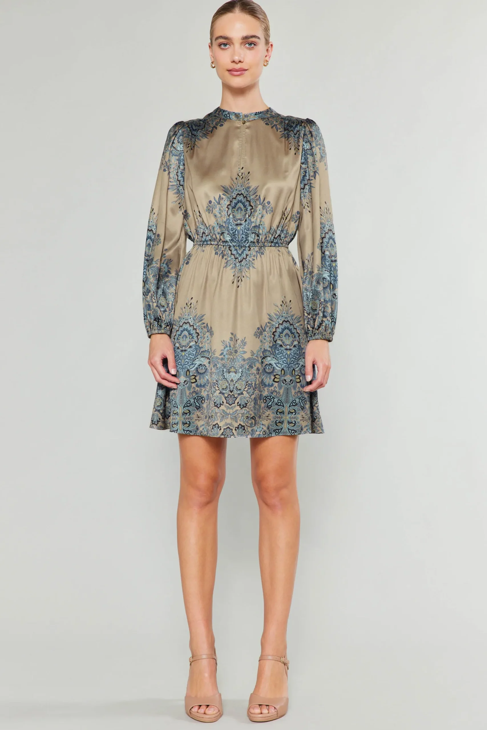 Rendered in a striking blue and taupe motif, this long-sleeve dress is defined by a split neckline with a mandarin collar and self-tie detailing that lets you adjust the silhouette.