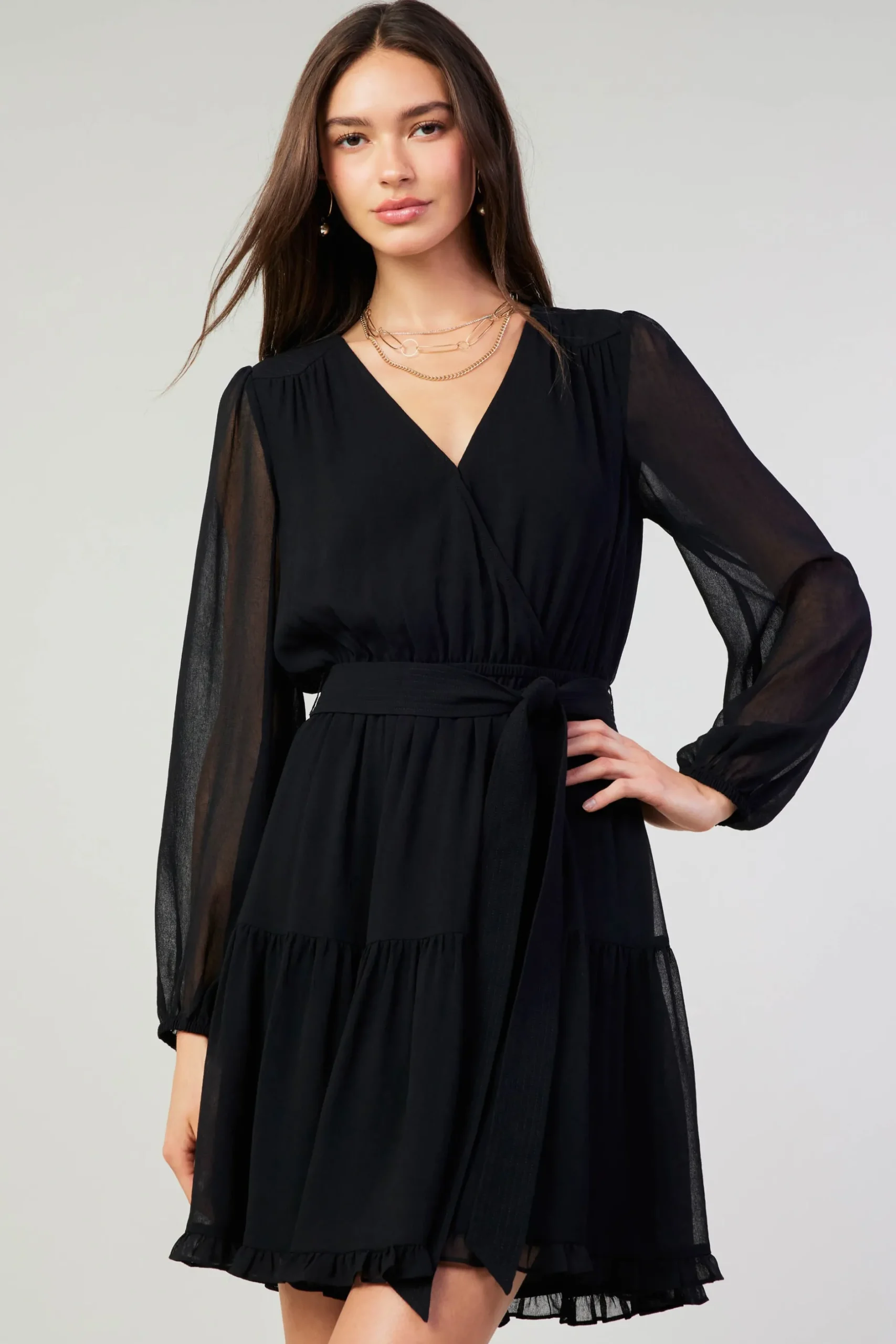 This long-sleeve mini dress has all the makings of a favorite. It flatters with a surplice-style bodice and cinches in at the waist with a belt before falling to a swingy hem. Hits of ruffles finish the look with a sweet touch.