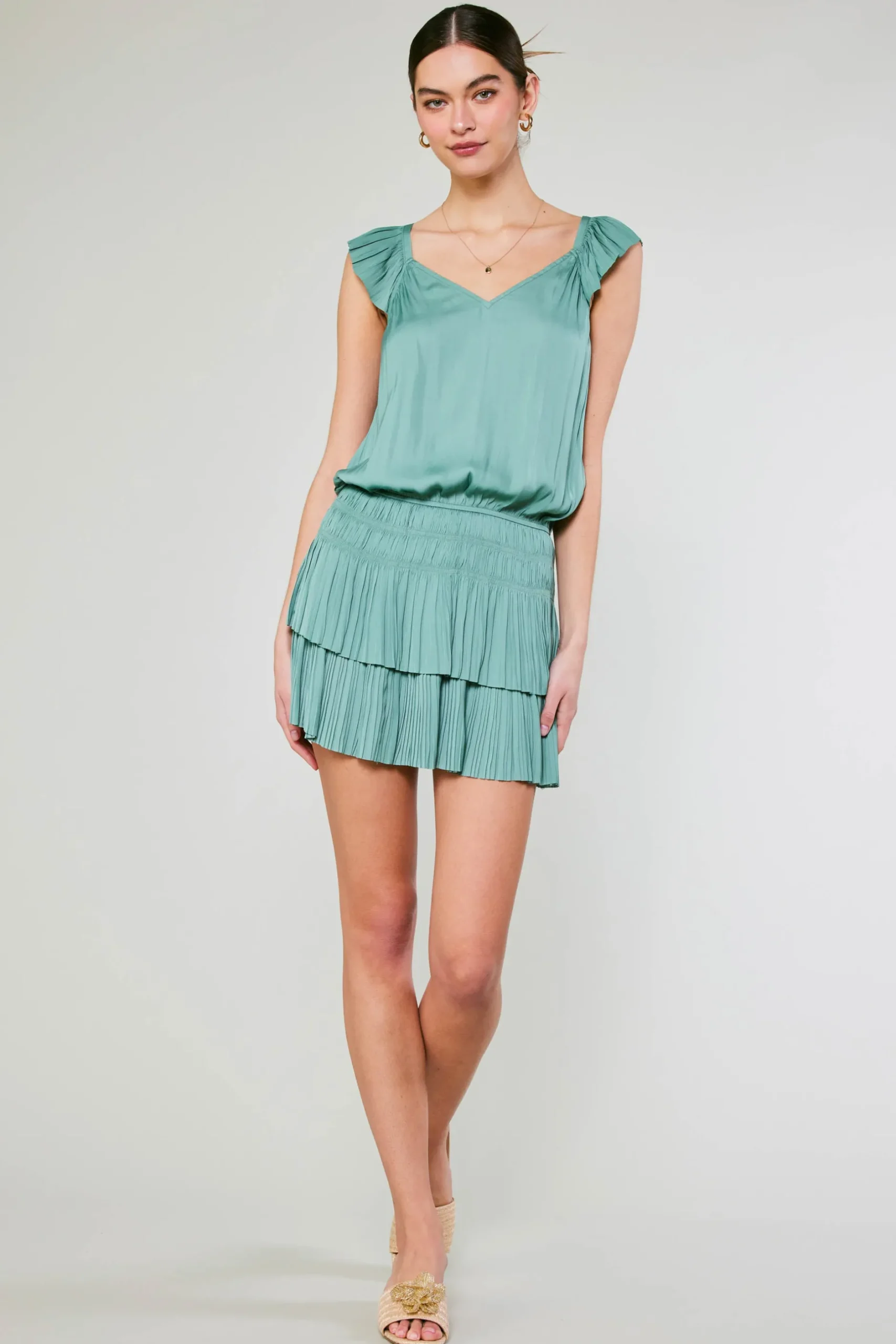 Fluttery, pleated, pretty much perfect. This sweetheart neck mini dress is one you’ll turn to repeatedly. A swingy skirt give it lots of movement, while the smocked waist flatters the shape.