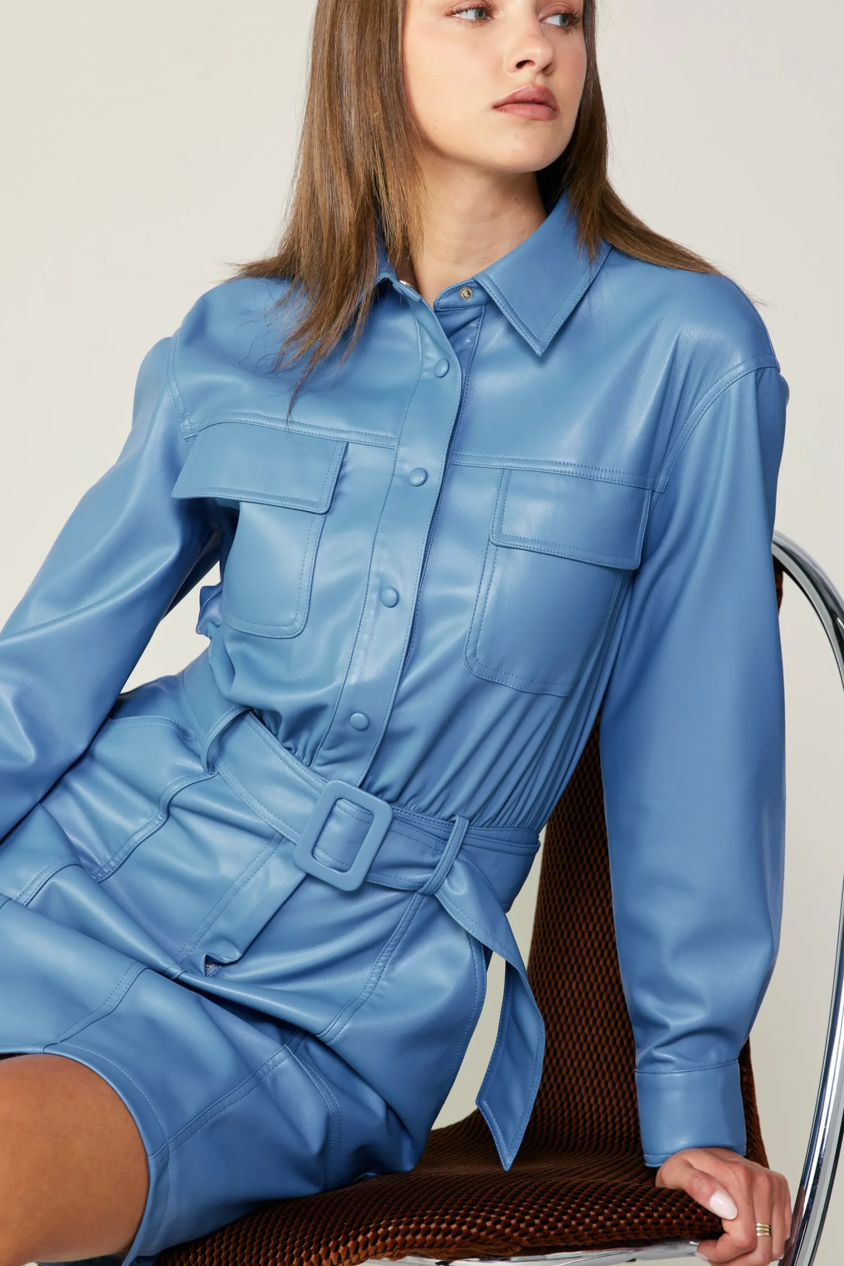 This long-sleeve shirt dress offers a luxe twist on the utility trend with supple vegan leather in a sky blue shade. Featuring a pointed collar, flap pockets, and covered buttons at the front, the silhouette can be cinched by the buckle belt, letting you define the waist. Double-stitch detailing and patch pockets complete the look.