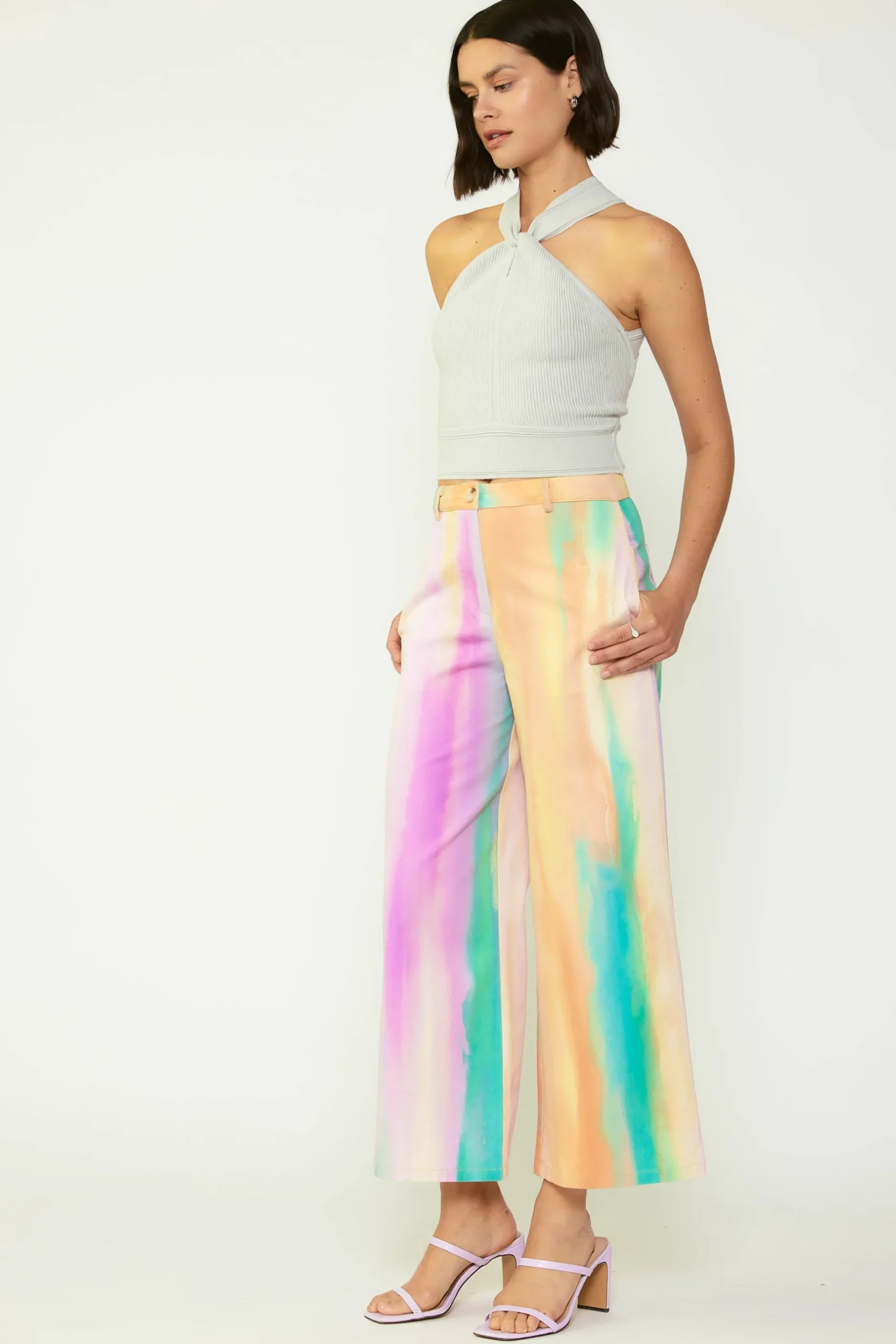 These wide-leg pants are a fun way to play with color. They’re cut for a high-waisted silhouette and feature a gradation of pastel hues that create a captivating sunrise effect.