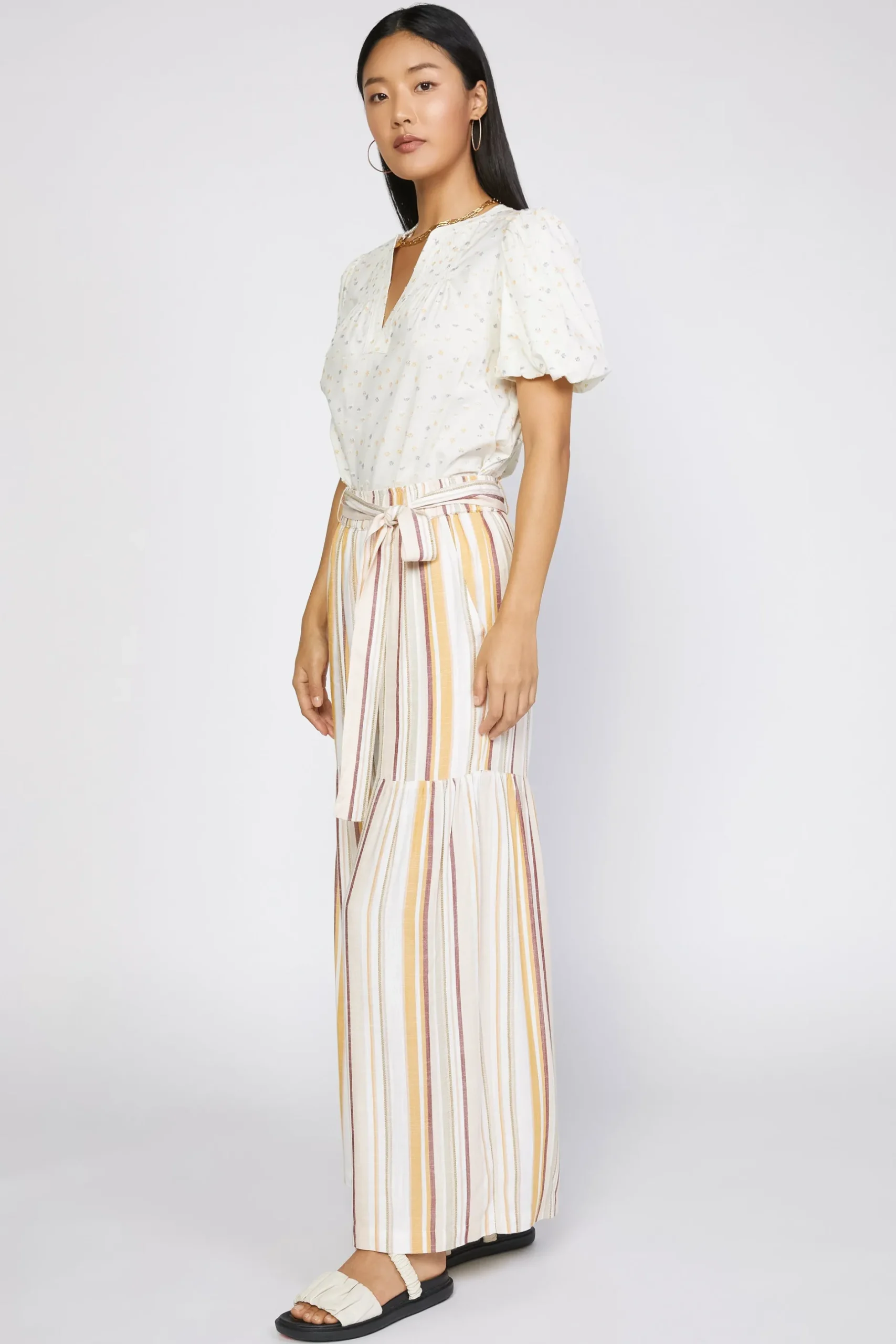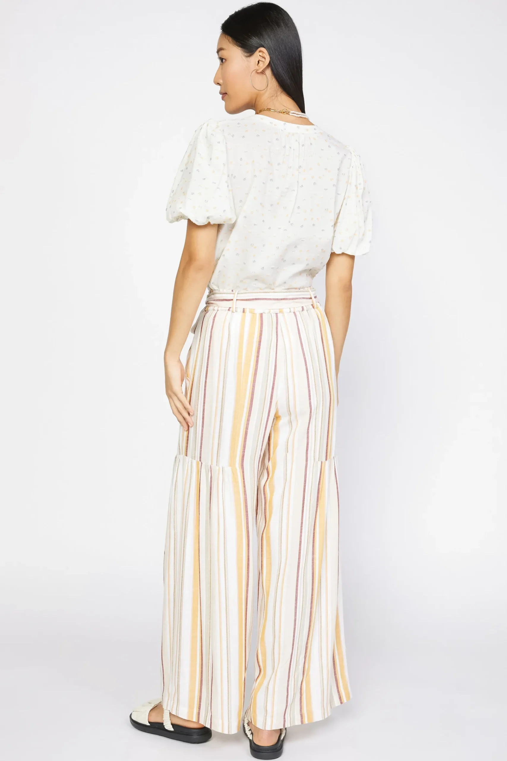 Done in a fun stripe pattern, these wide-leg pants will have you dreaming up a warm-weather escape. The pair slips on with ease and sits comfortably high on the natural waist, cinched by a self-tie belt.