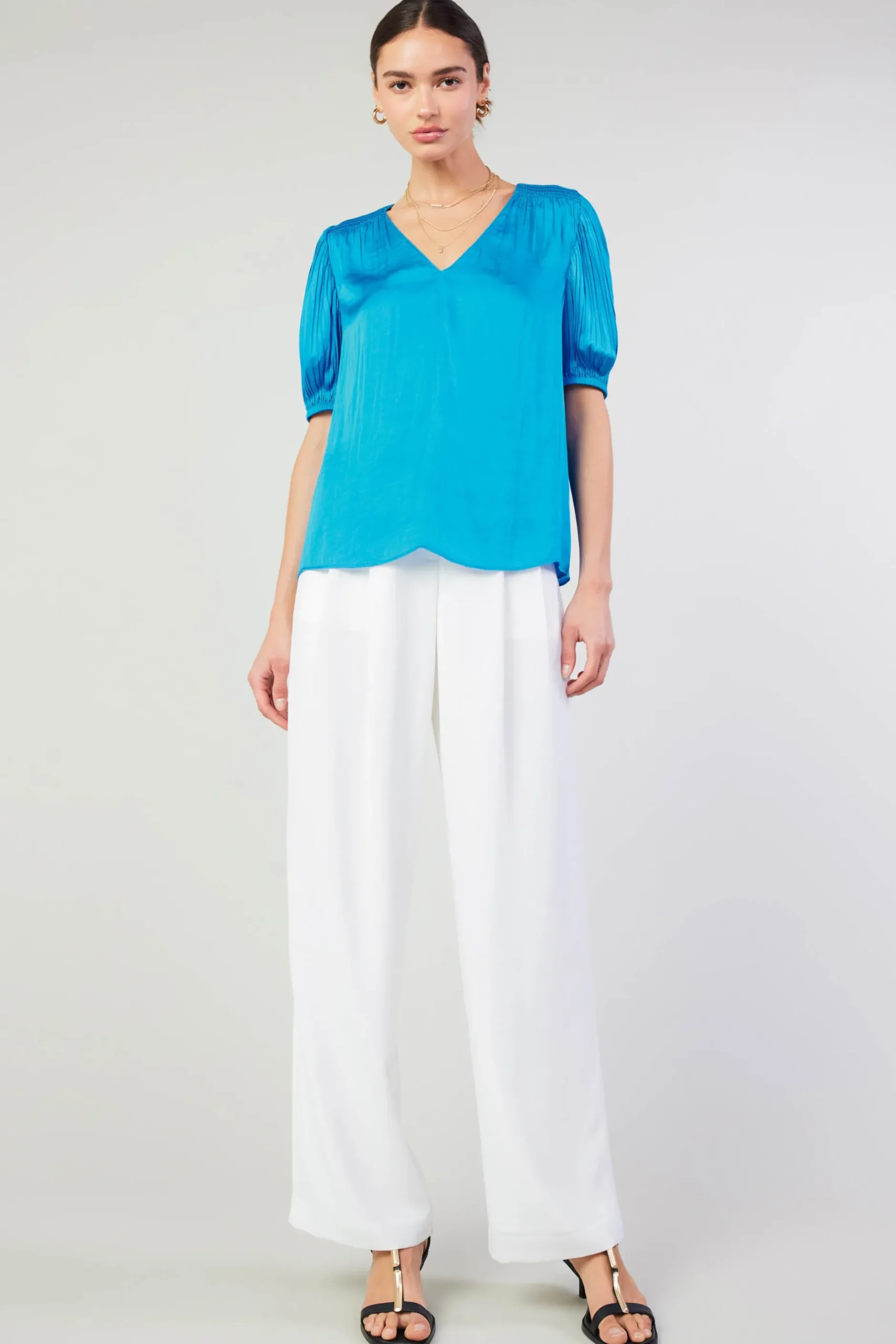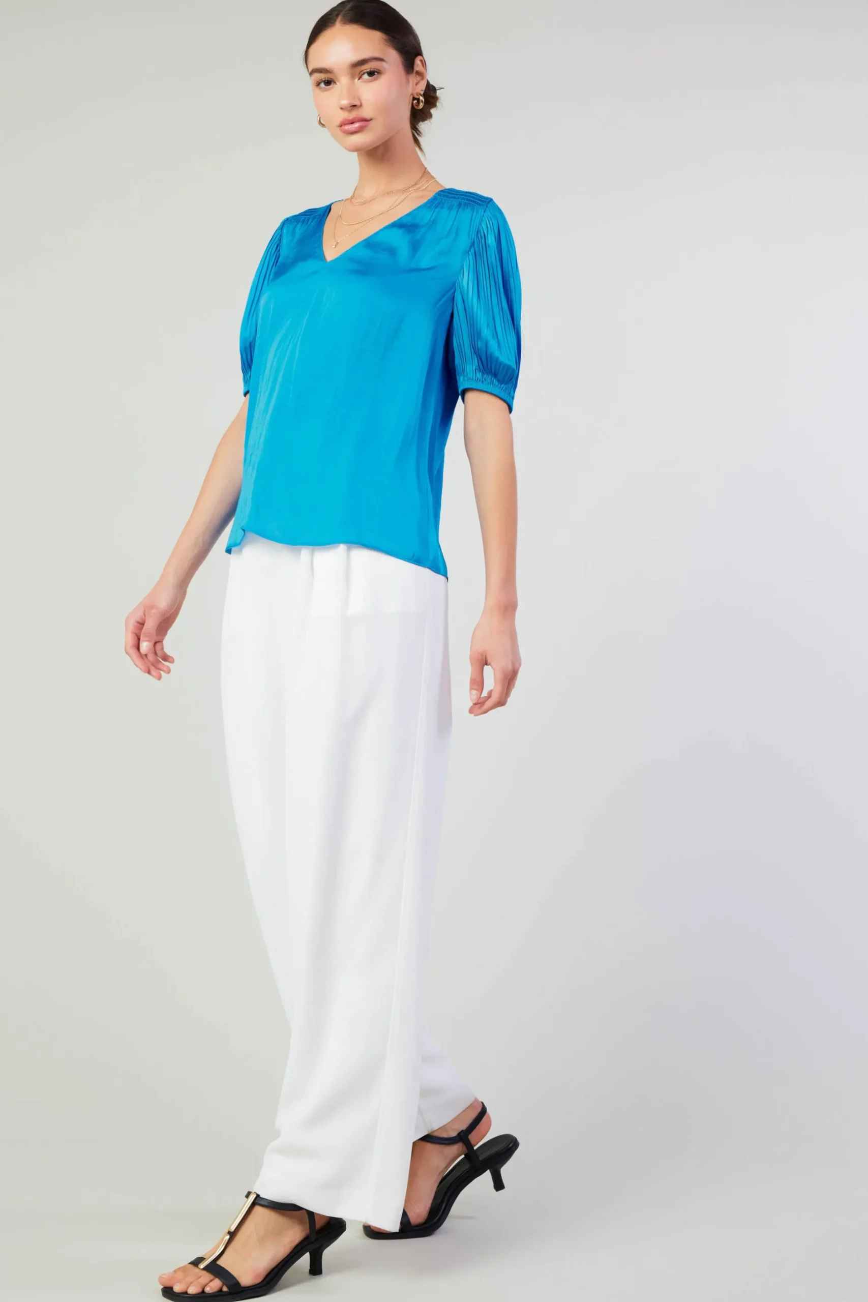 The brighter side of the season. This V-neck blouse comes in a mood-boosting shade of blue to highlight the style’s smocked shoulders and pleated sleeves.