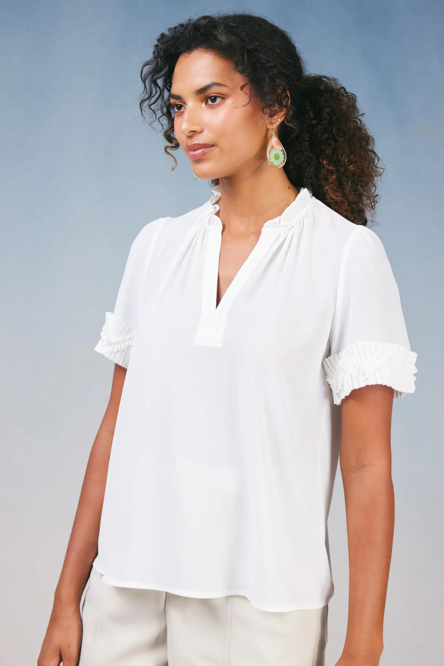 The silhouette of this short-sleeve blouse may be simple, but pleated trim and layered ruffle detailing set it apart. Featuring a split neckline with gentle gathers, the popover style elevates your look with minimal effort.