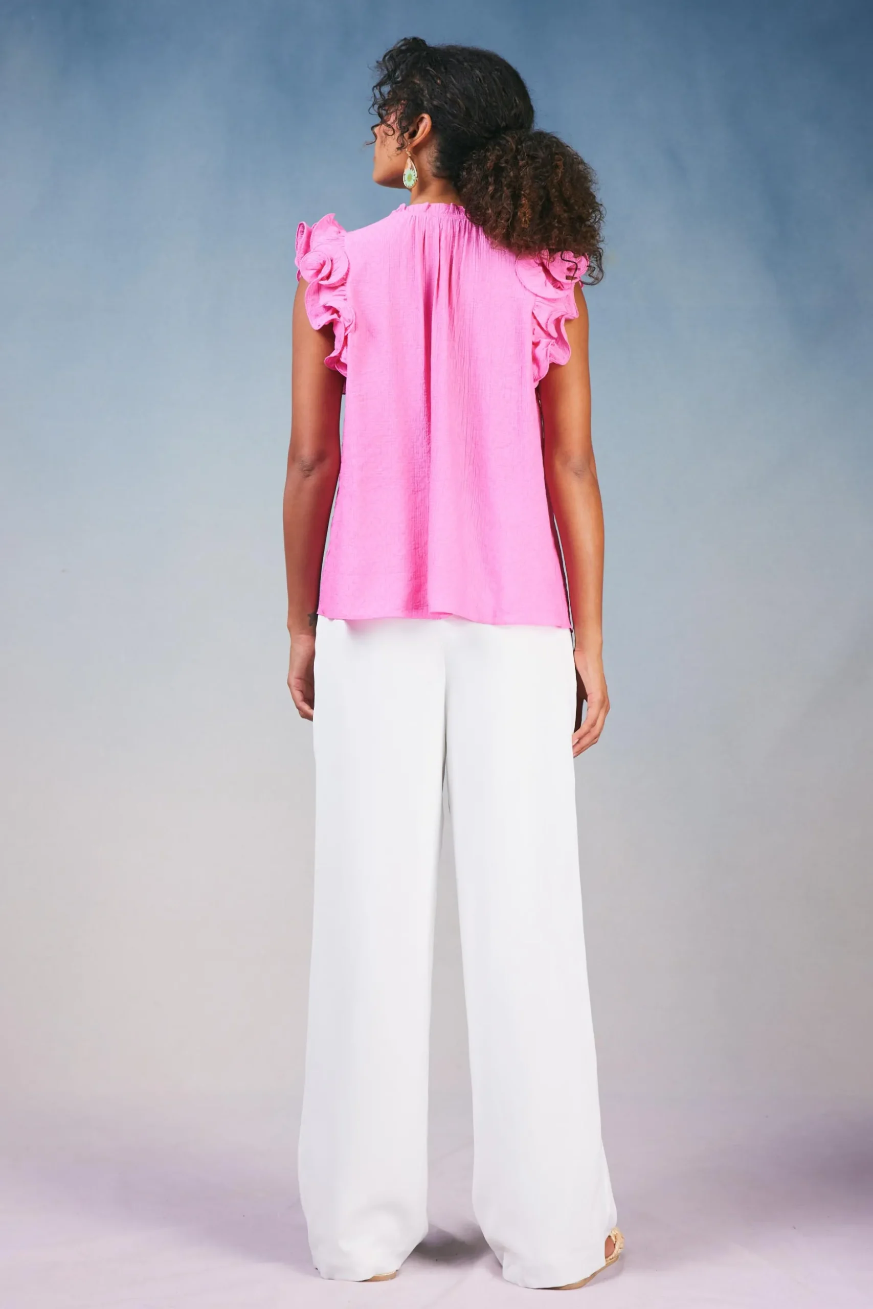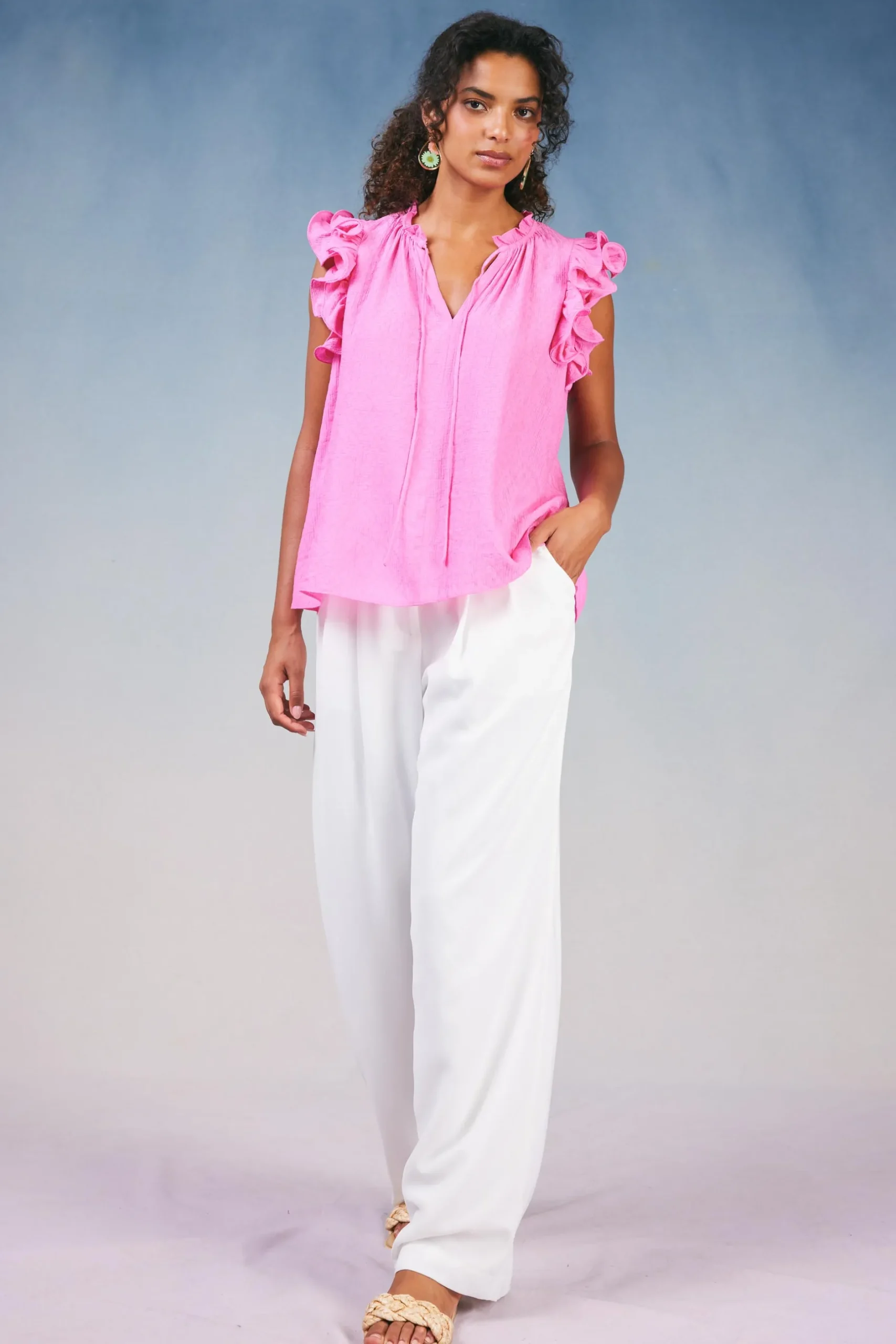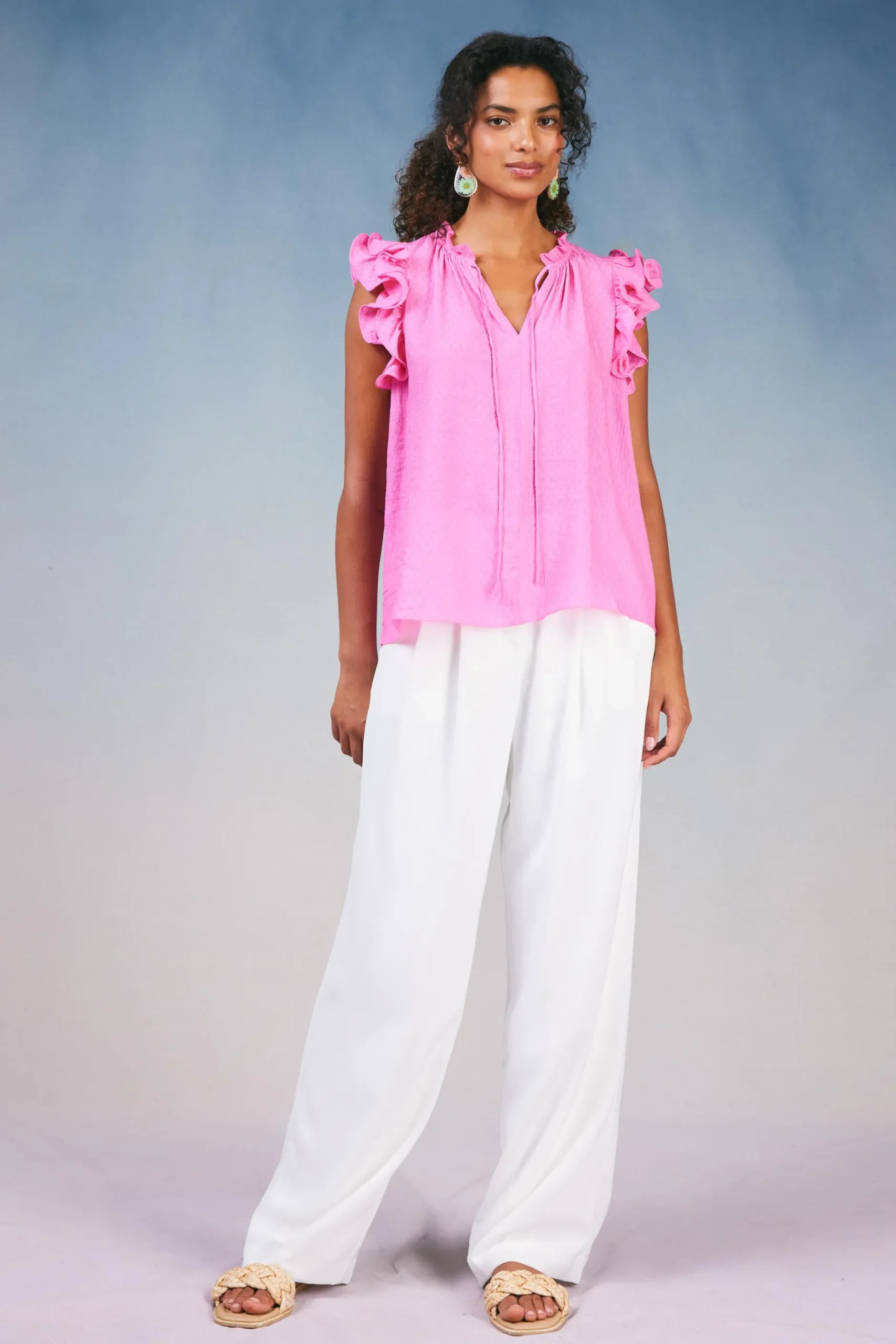 Add pink to your wardrobe with this tank. It’s cut for a relaxed fit featuring a flattering split neckline and trimmed with ruffles at the shoulders for a feminine finish.