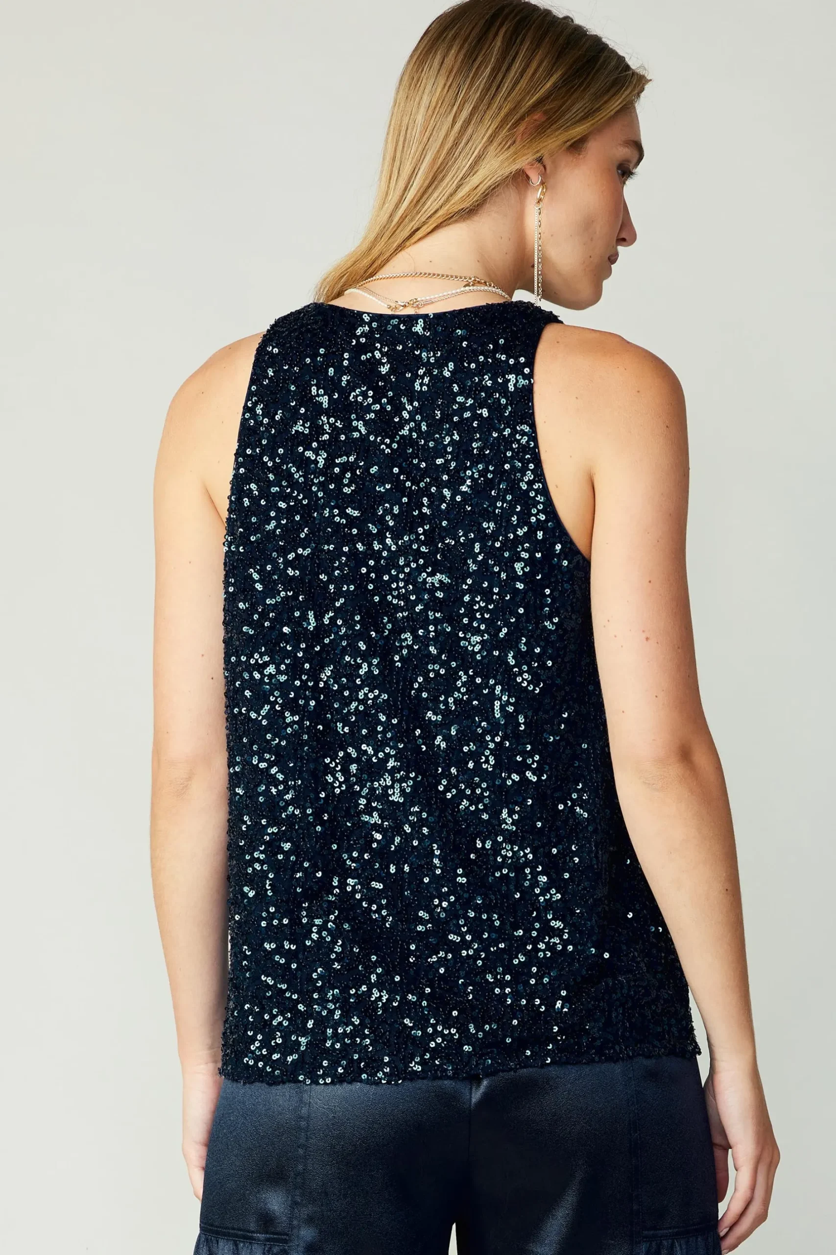 Covered in twinkling dark-blue sequins, this tank instantly transforms any look. Cut with a round neckline and a slightly relaxed fit, it’s got so much party potential.