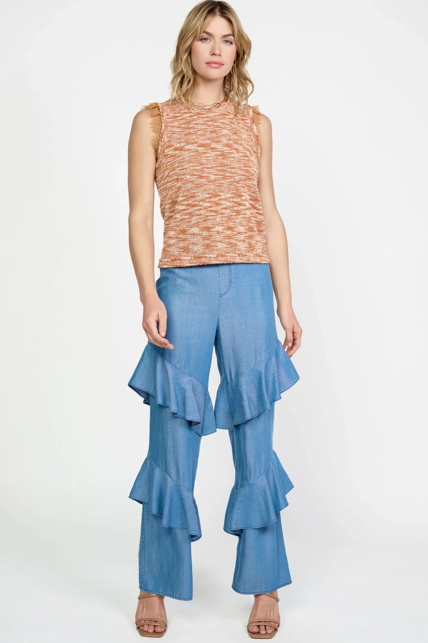 A ’90s-esque space-dye knit meets a touch of lace trim and a scalloped neckline. Grab this sleeveless sweater top for a cozy feel during the warmer months.